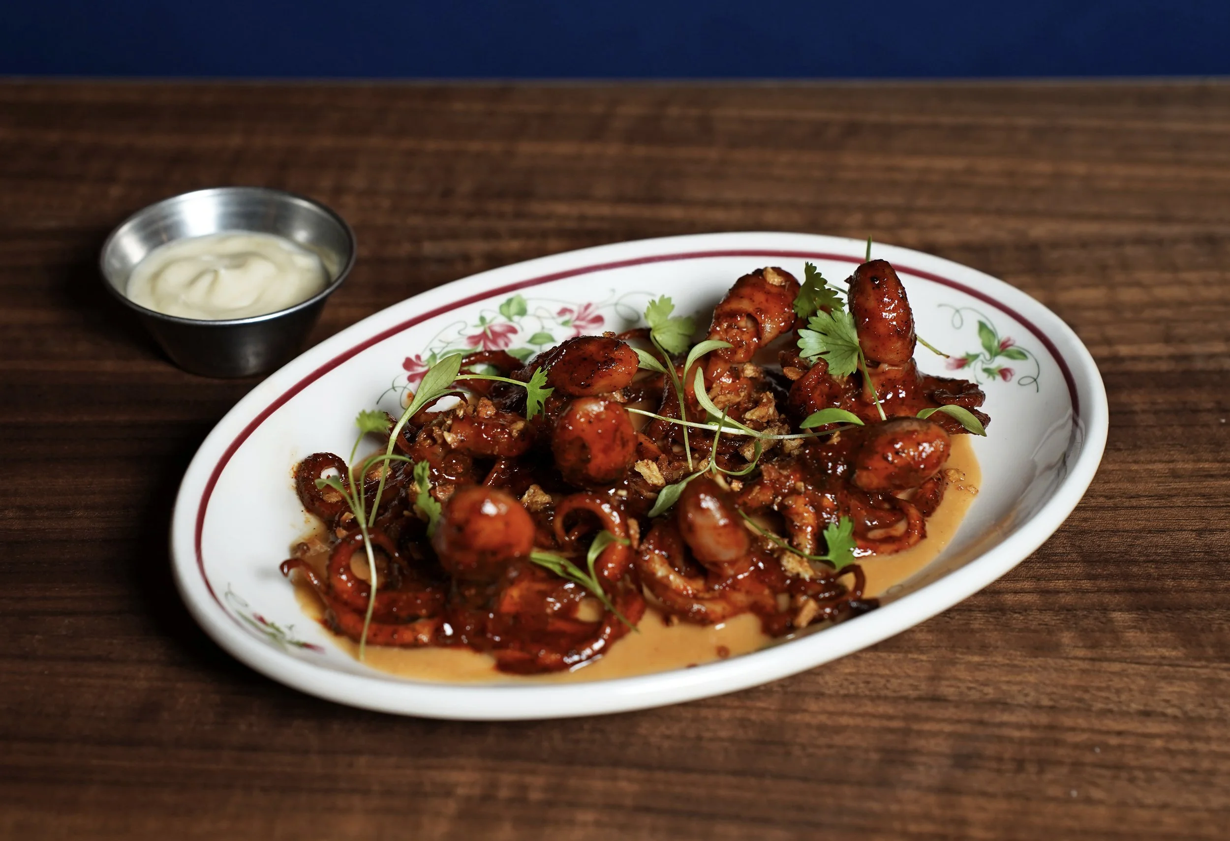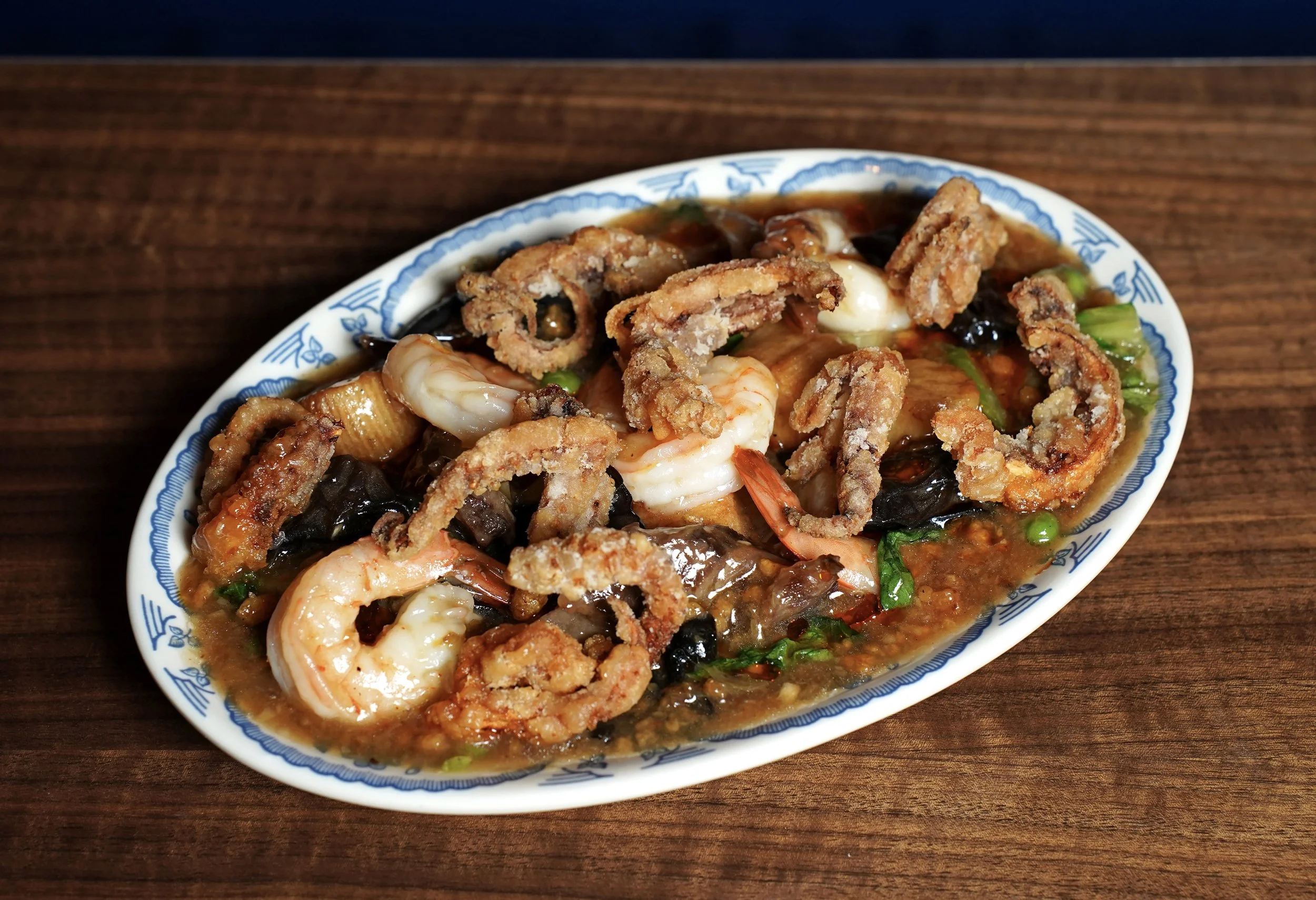 Korean-Chinese inspired, Wok-Tossed Shrimp, Fish Cake, Finger Ribs and Fried Squid in Umami Gravy Sauce