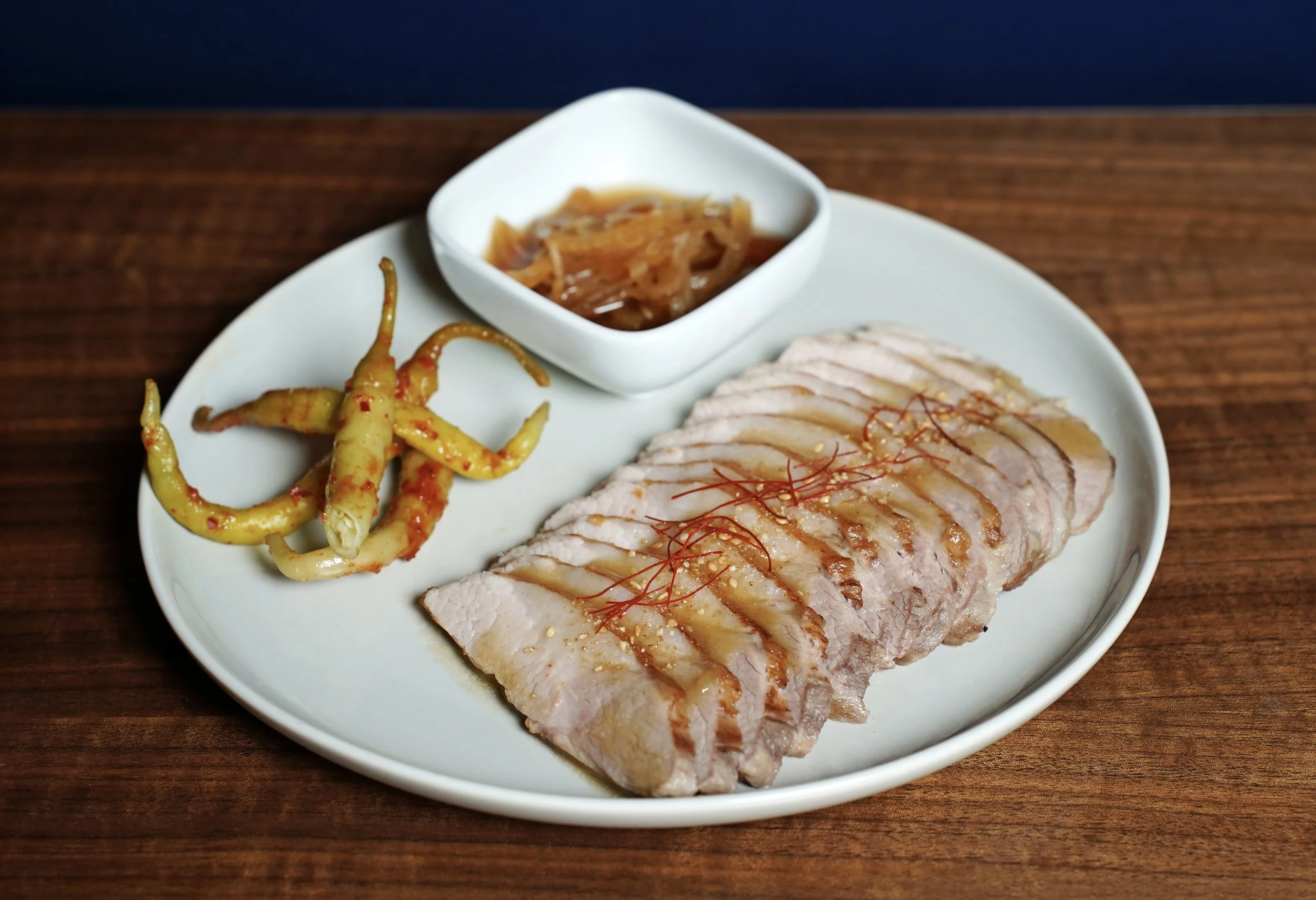 Gochujang Marinated Sliced Duck, Perilla Seeds, Micro Mustard, Kongnamul