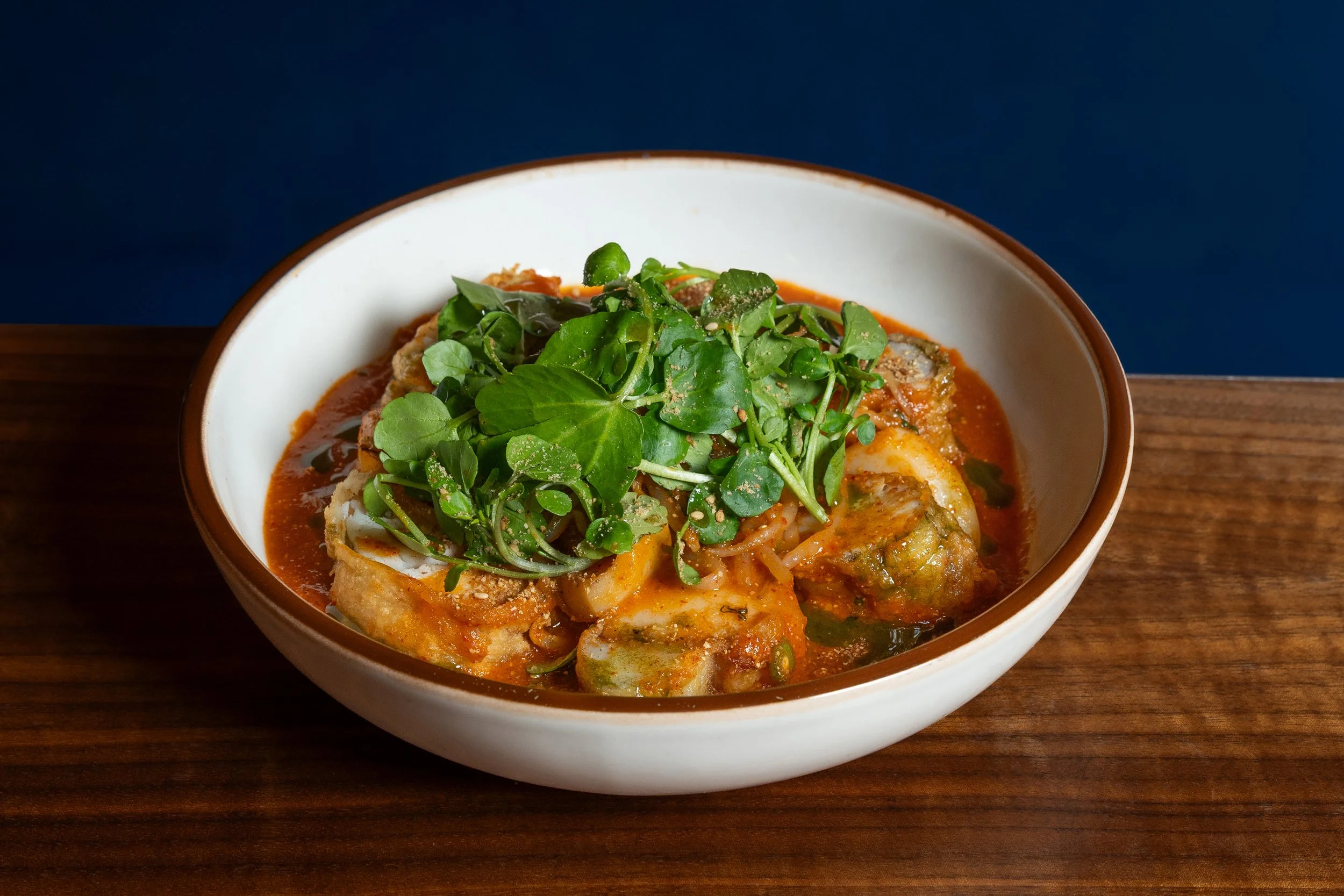 Seasonal Fish, Sujebi, Charred Scallion Oil in Rich Fish Broth, Served with a Bowl of Rice